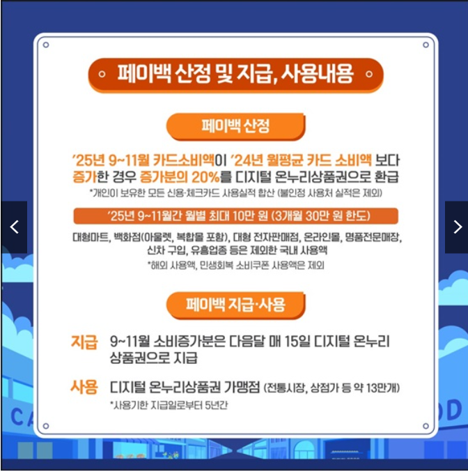 - 산정 기준: 2025년 9~11월 카드 소비액이 2024년 월평균 카드 소비액보다 증가한 경우, 증가분의 20%를 디지털 온누리상품권으로 환급.