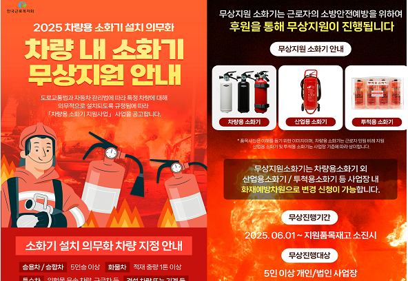 2025년부터는 차량 내 소화기 비치가 의무화되며, 이를 지키지 않을 경우 큰 불이익이 따릅니다. 하지만 지금 바로 신청하면 근로자는 비용 부담 없이 소화기를 확보할 수 있고, 교육까지 받아 화재 대응 능력도 강화할 수 있습니다.